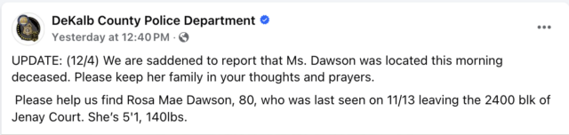 DECATUR, GA—Eighty-year-old Rosa Mae Dawson, a diabetic with dementia who was missing for three weeks, was found dead on Wednesday, Dec. 4, DeKalb County Police said.