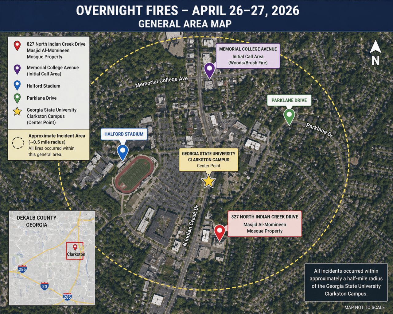 The first fire was reported on Sunday, April 26, around 8:30 p.m. near Memorial College Avenue. A series of other fires occurred near Parklane Drive, Hallford Stadium and North Indian Creek Drive in Clarkston.