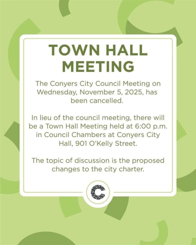 CONYERS, GA- Residents who live within the city limits of Conyers are urged to attend a town hall meeting where proposed changes to the city’s charter will be discussed. The meeting is scheduled for Wednesday, Nov. 5, at 6 p.m., at City Hall, 901 O’Kelly St., Conyers.