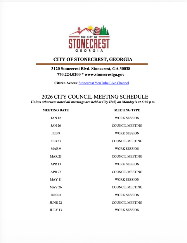 • City of Stonecrest 2026 City Council Meeting Schedule