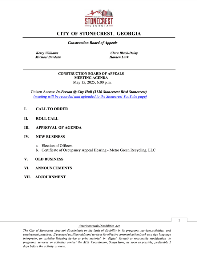Home»Legal Notices»City of Stonecrest AGENDA_Construction Board of Appeals_5/15/2025