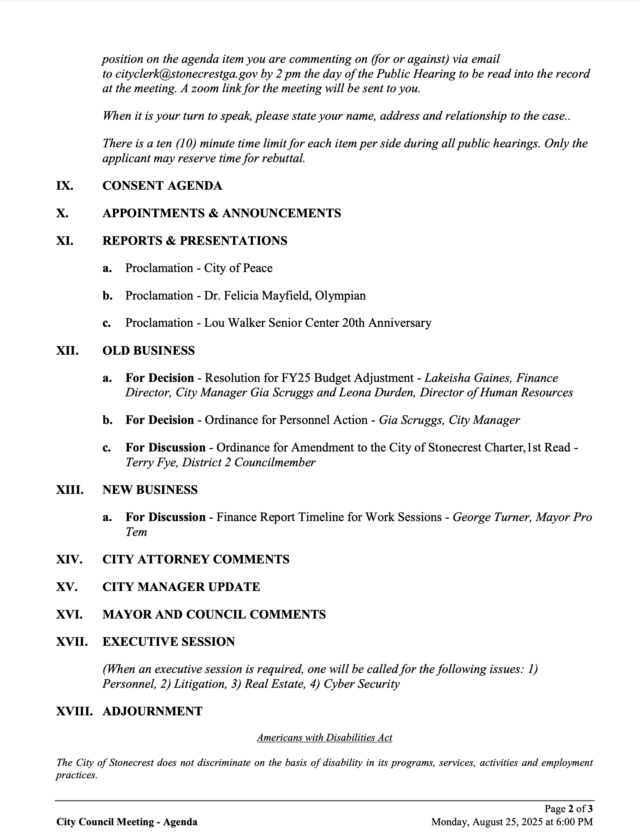 City of Stonecrest August City Council Agenda – 8/25/2025