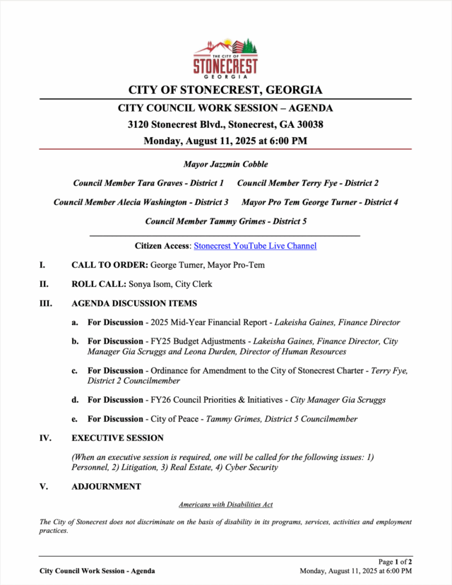 Home»Legal Notices»City of Stonecrest August Work Session – August 11, 2025 @ 6pm
