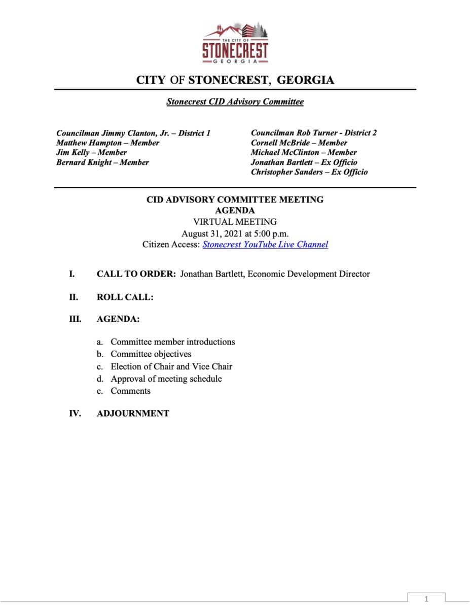 City of Stonecrest CID Advisory Committee Virtual Meeting Aug. 31, 5 p.m.