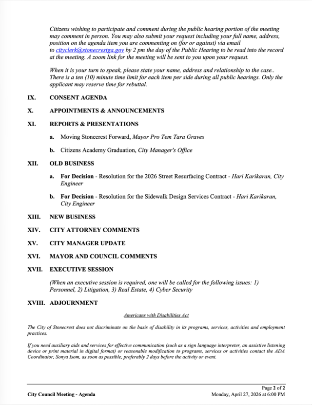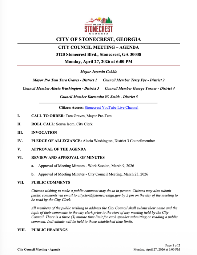 Home»Legal Notices»City of Stonecrest City Council Meeting – April 27, 2026 @ 6pm
