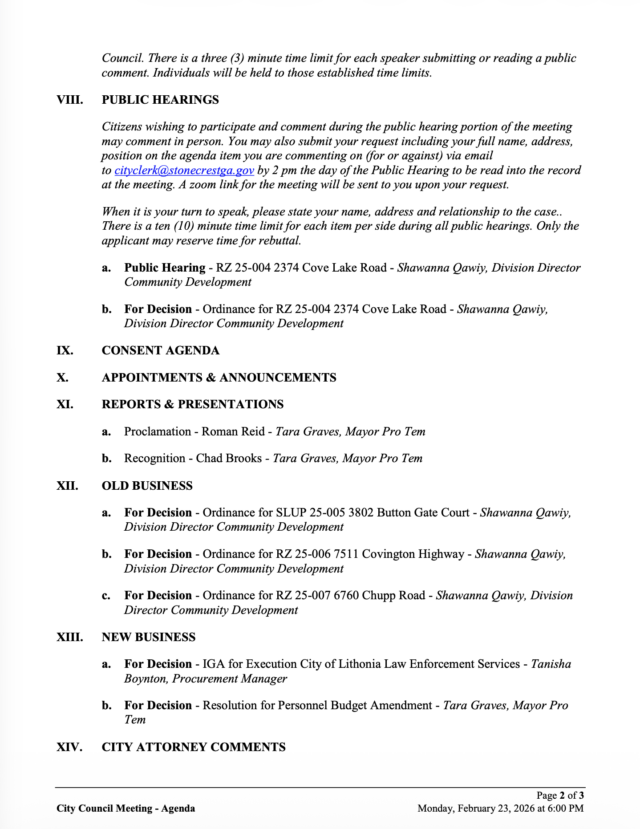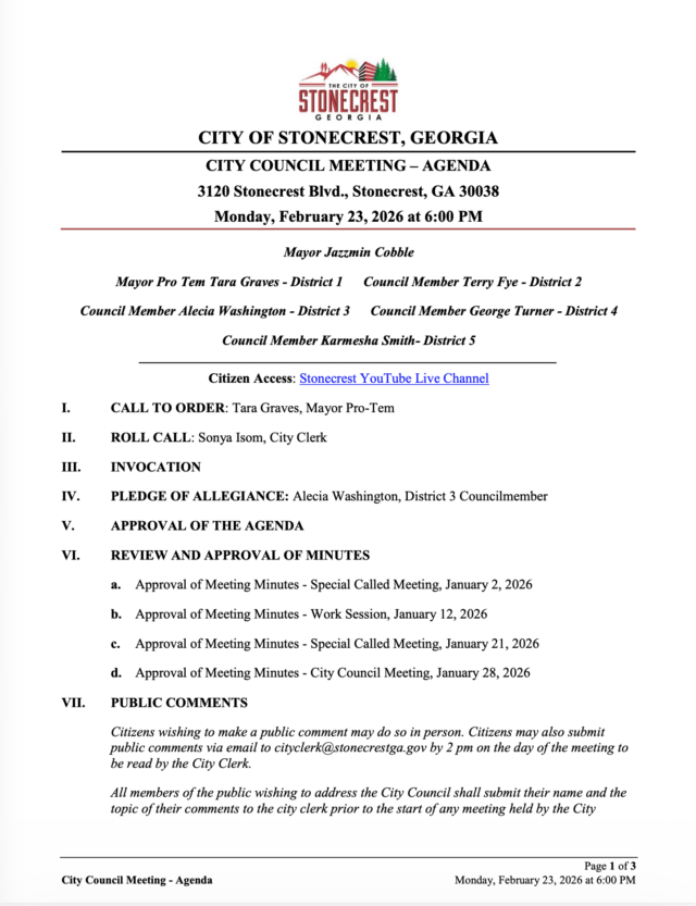 Home»Legal Notices»City of Stonecrest City Council Meeting – February 23, 2026 @6pm