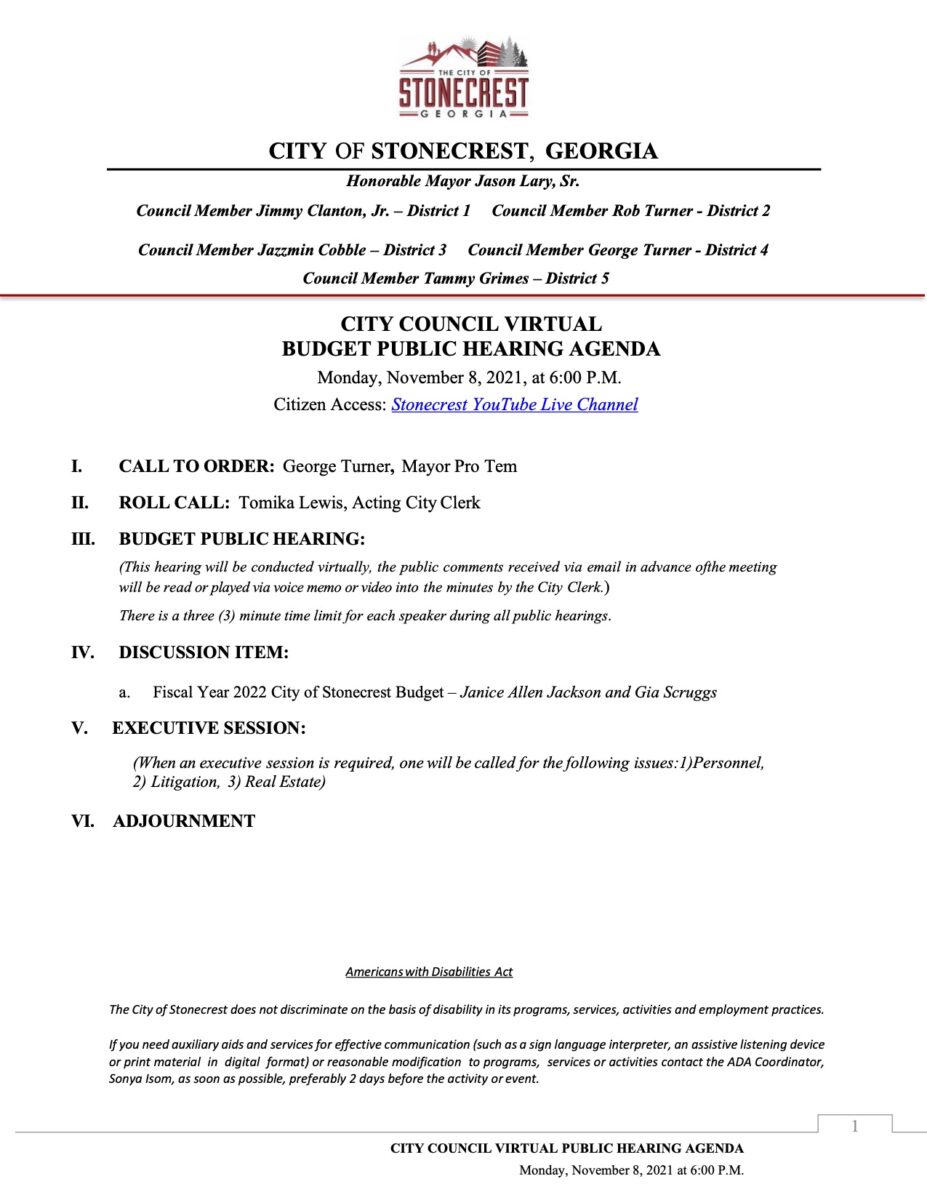 City of Stonecrest City Council Virtual Budget Public Hearing, Nov. 8, 6 p.m.