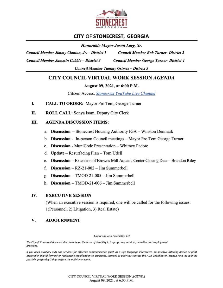 City of Stonecrest City Council Work Session, Aug. 9, at 6 p.m.