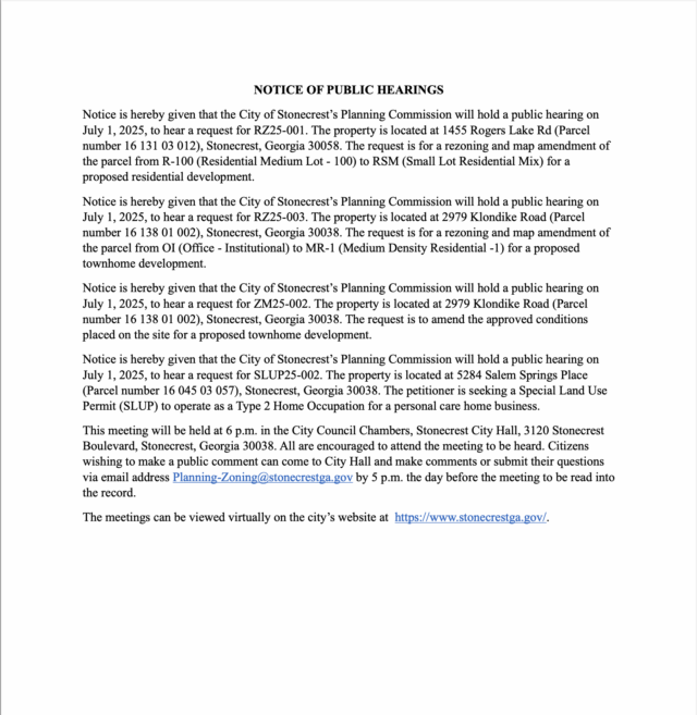 Home»Legal Notices»City of Stonecrest Planning Commission Meeting, July 1, 2025