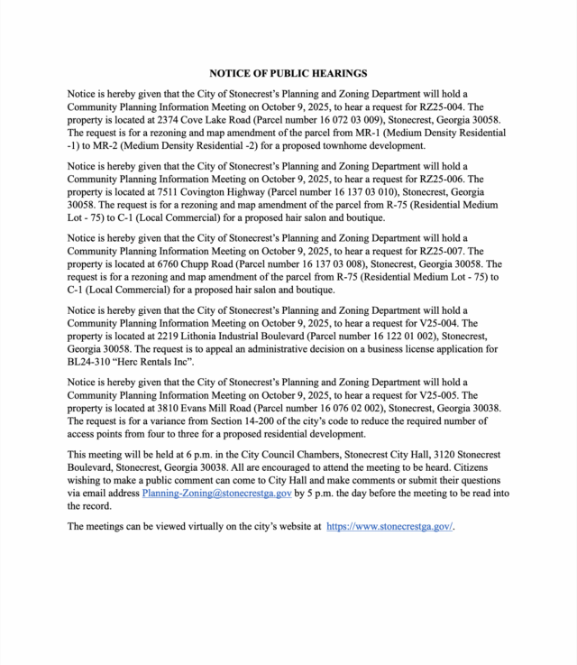 Home»Legal Notices»City of Stonecrest Community Planning Information Meeting, October 9, 2025