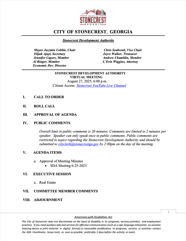 Home»Legal Notices»City of Stonecrest Development Authority Meeting Aug 27, 2025