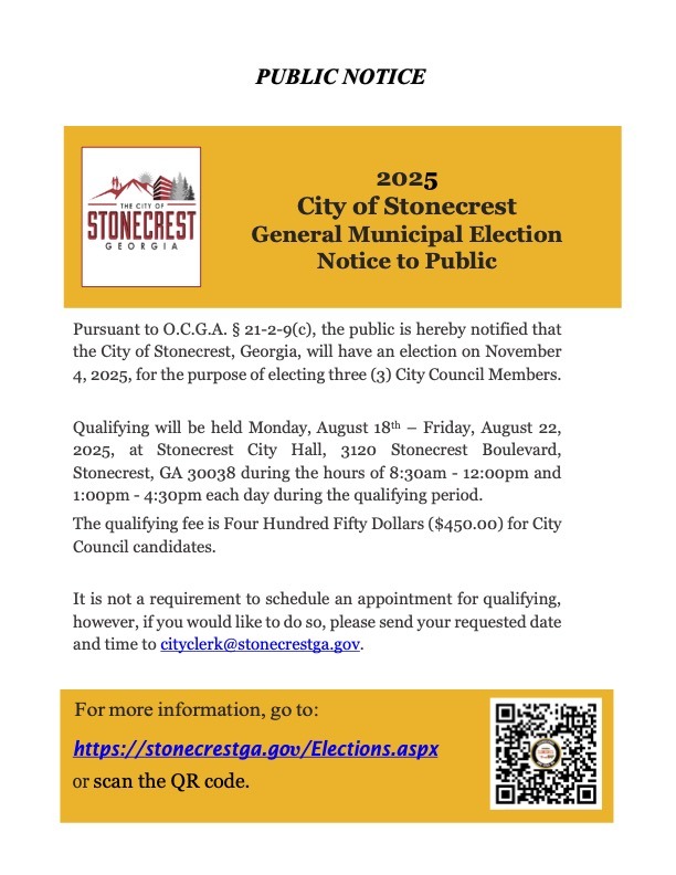 Home»Local News»City of Stonecrest Election and Qualifying Public Notice