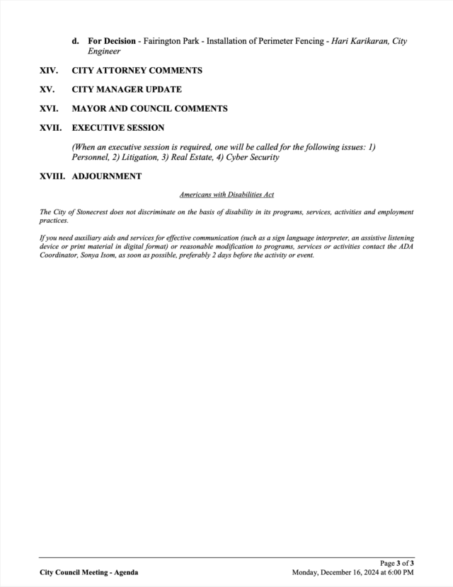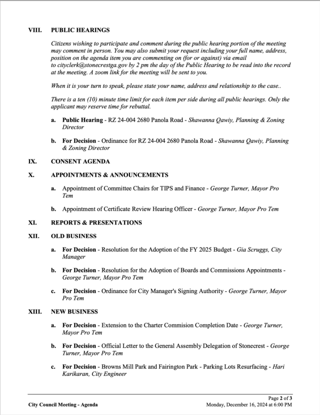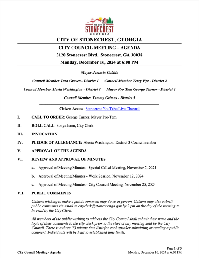 City of Stonecrest NOTICE – City Council Meeting, December 16, 2024