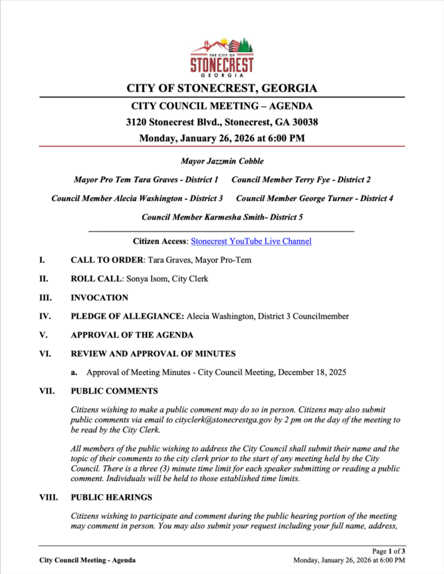 Home»Legal Notices»City of Stonecrest NOTICE – City Council Meeting, January 26, 2026