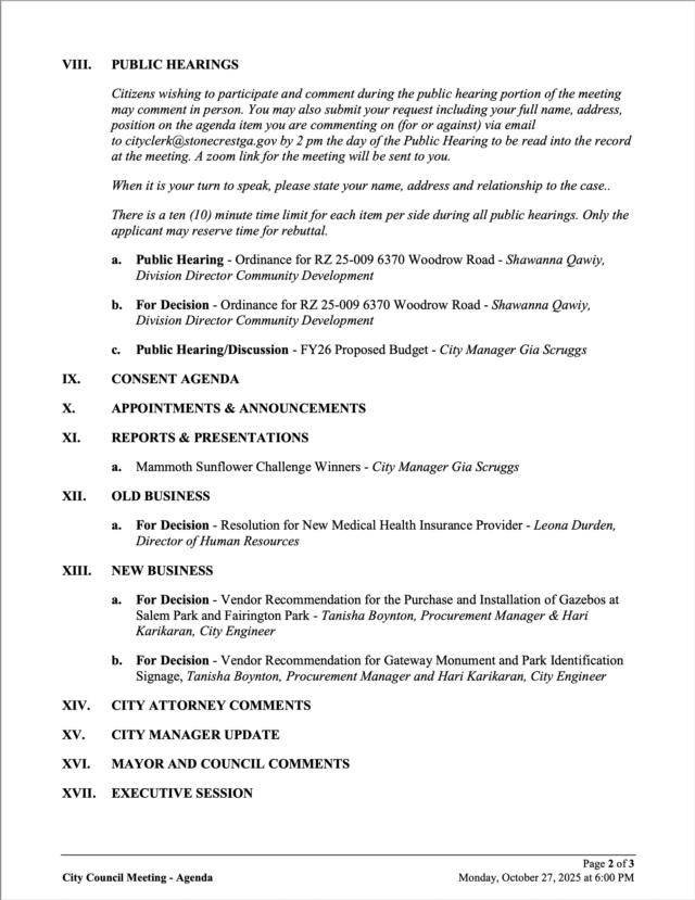 City of Stonecrest NOTICE – City Council Meeting, October 27, 2025