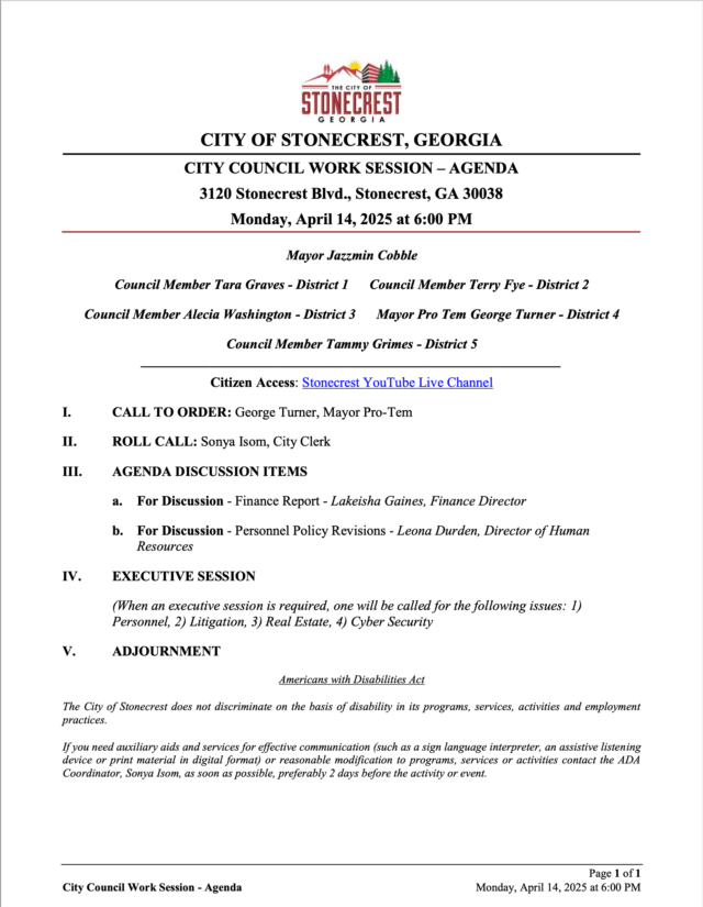 City of Stonecrest NOTICE – City Council Work Session, April 14, 2025