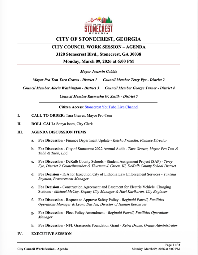 • City of Stonecrest NOTICE -City Council Work Session, March 9, 2026