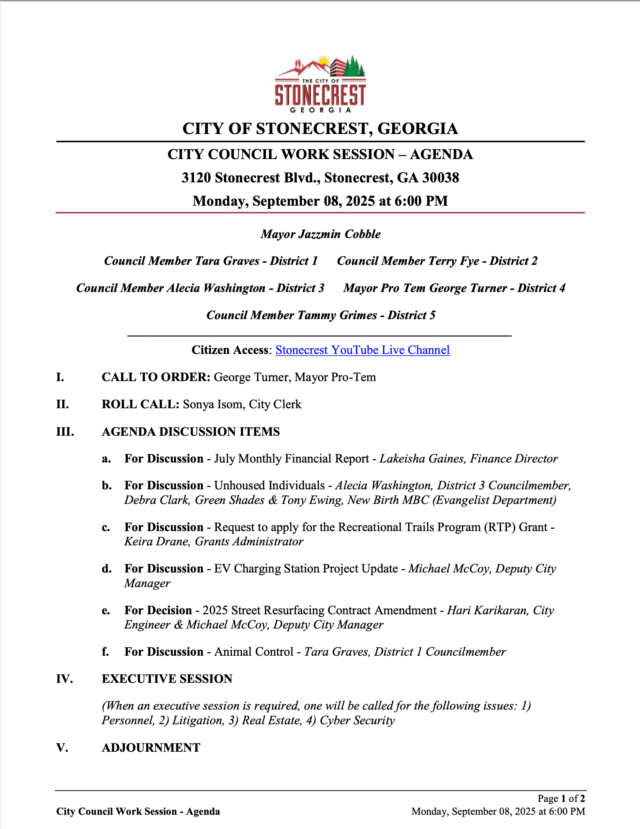 Home»Legal Notices»City of Stonecrest NOTICE – City Council Work Session, September 8, 2025
