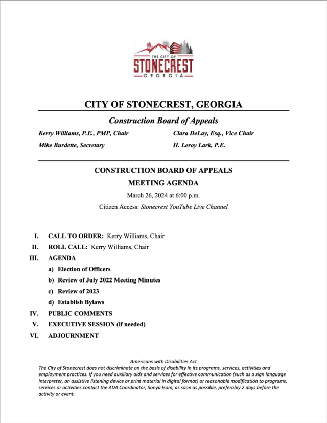 City of Stonecrest NOTICE – Construction Board of Appeals Meeting – March 26, 2024