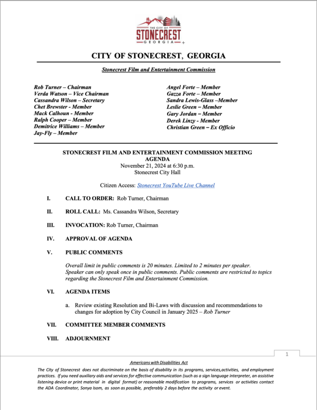 City of Stonecrest NOTICE – FILM COMMISSION MEETING, NOVEMBER 21, 2024