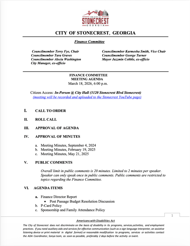 Home»Legal Notices»City of Stonecrest NOTICE – Finance Committee Meeting, March 18, 2026