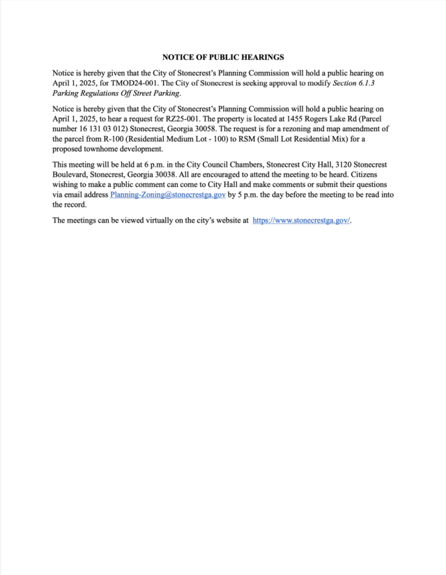 Home»Legal Notices»City of Stonecrest NOTICE – Planning Commission Meeting, April 1, 2025