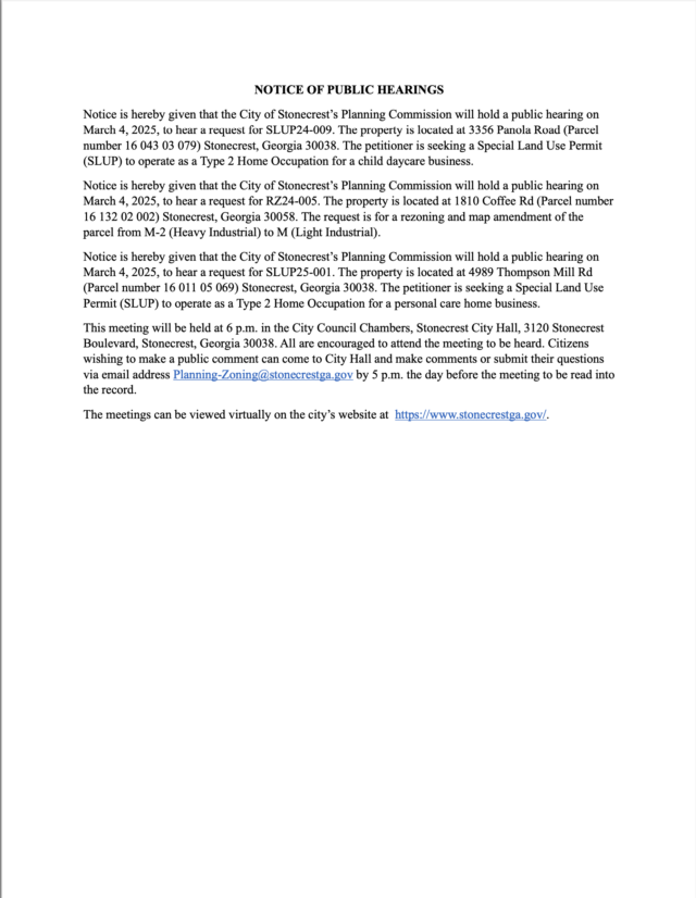 Home»Legal Notices»City of Stonecrest NOTICE – Planning Commission Meeting, March 4, 2025