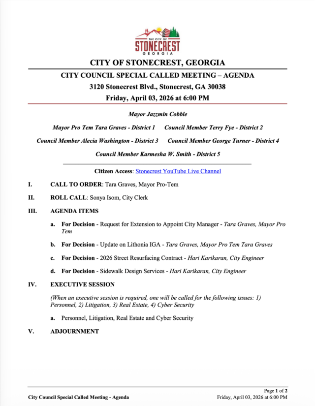 Home»Legal Notices»City of Stonecrest NOTICE – Special Called Meeting, April 3, 2026