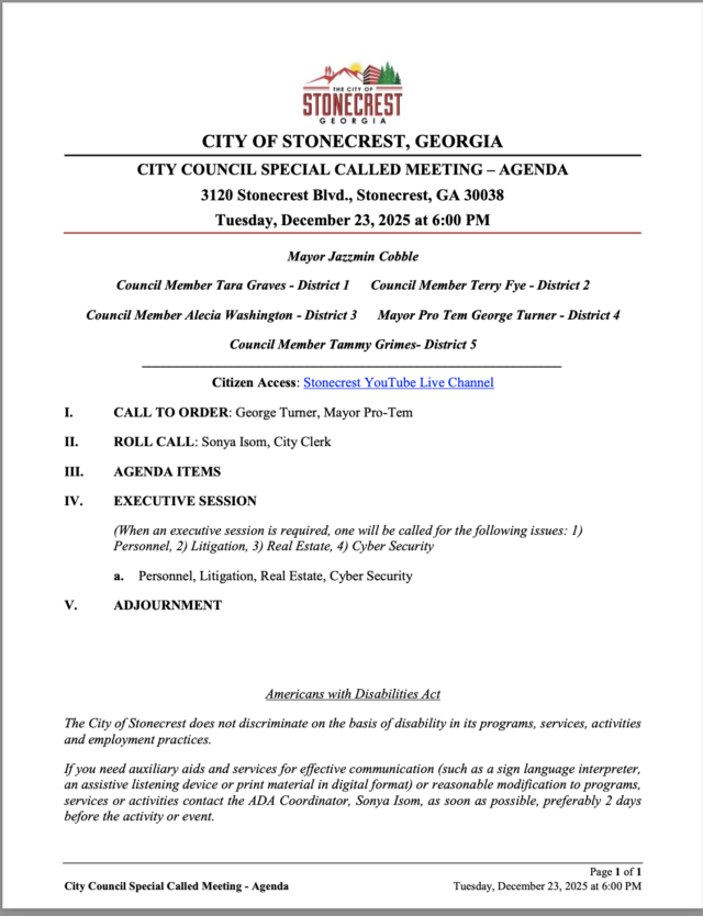 City of Stonecrest NOTICE – Special Called Meeting, December 23, 2025
