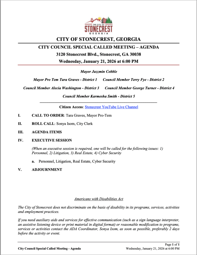 Home»Legal Notices»City of Stonecrest NOTICE – Special Called Meeting, January 21, 2026