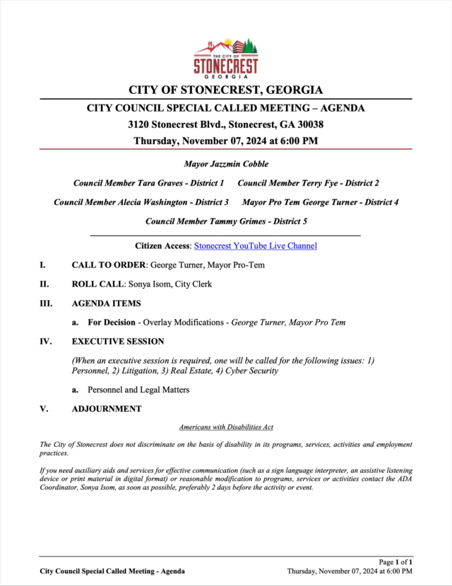 Home»Legal Notices»City of Stonecrest NOTICE – Special Called Meeting – November 7, 2024
