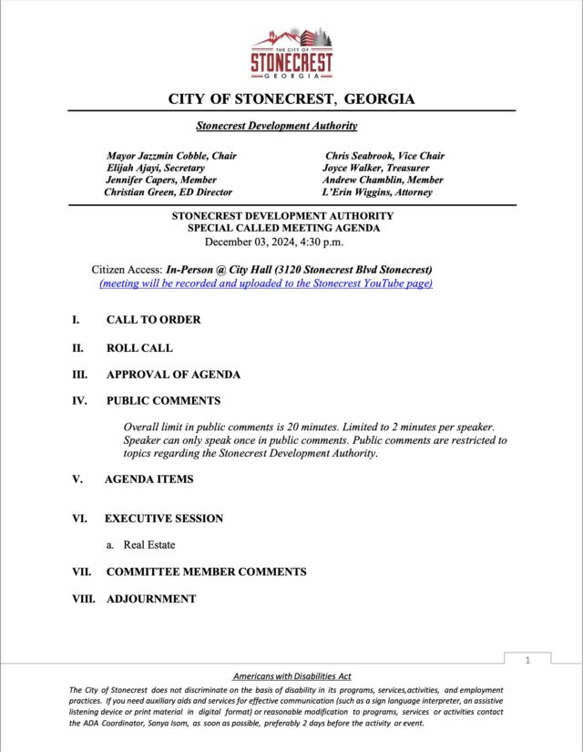 City of Stonecrest Notice – Special Called SDA Meeting Dec 3, 2024