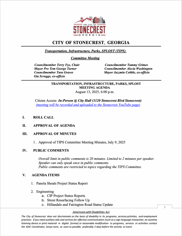 Home»Legal Notices»City of Stonecrest NOTICE – TIPS Committee Meeting, August 13, 2025
