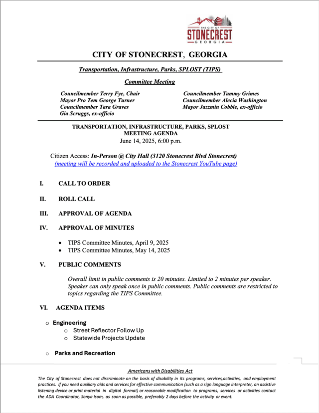 Home»Legal Notices»City of Stonecrest NOTICE – TIPS Committee Meeting, June 11, 2025