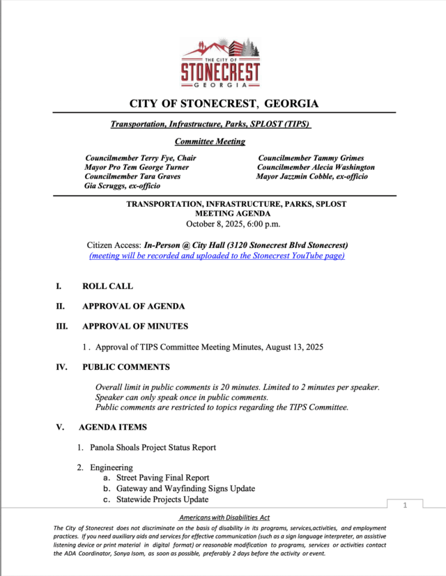 City of Stonecrest NOTICE – TIPS Committee Meeting, October 8, 2025