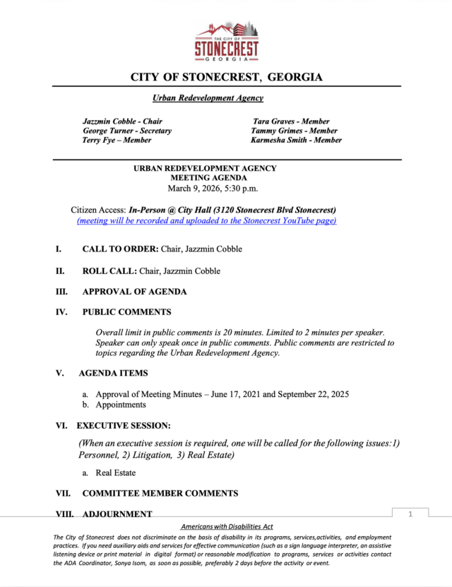 City of Stonecrest NOTICE – URA Meeting, March 9, 2026, 5:30pm