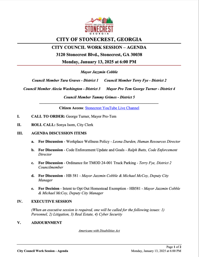 Home»Legal Notices»City of Stonecrest NOTICE – Work Session, January 13, 2025