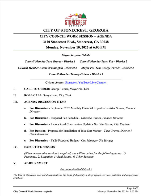 • City of Stonecrest November Work Session Agenda – 11/10/2025