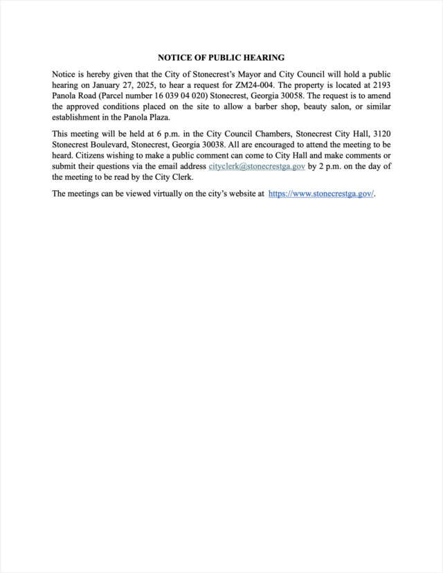 City of Stonecrest Planning and Zoning Public Hearing Notice – January 27, 2025 Thank you,
