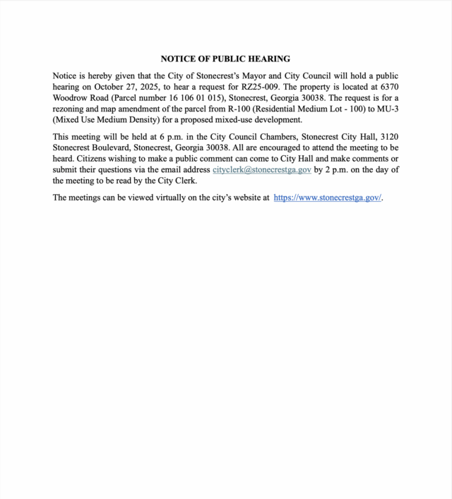 Home»Legal Notices»City of Stonecrest Planning and Zoning Public Hearing Notice – October 27, 2025