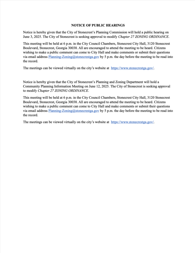 City of Stonecrest Planning and Zoning Public Hearing Notices – June 2025
