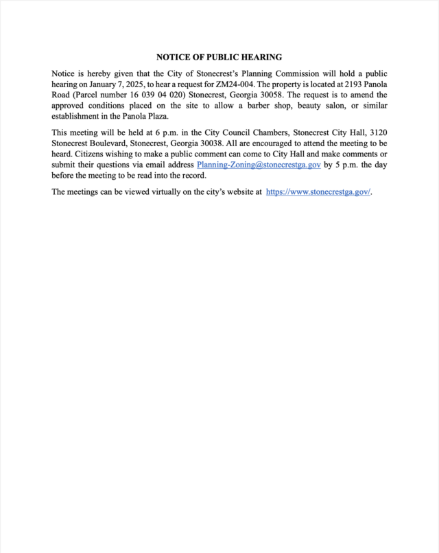 Home»Legal Notices»City of Stonecrest Planning Commission, January 7, 2025
