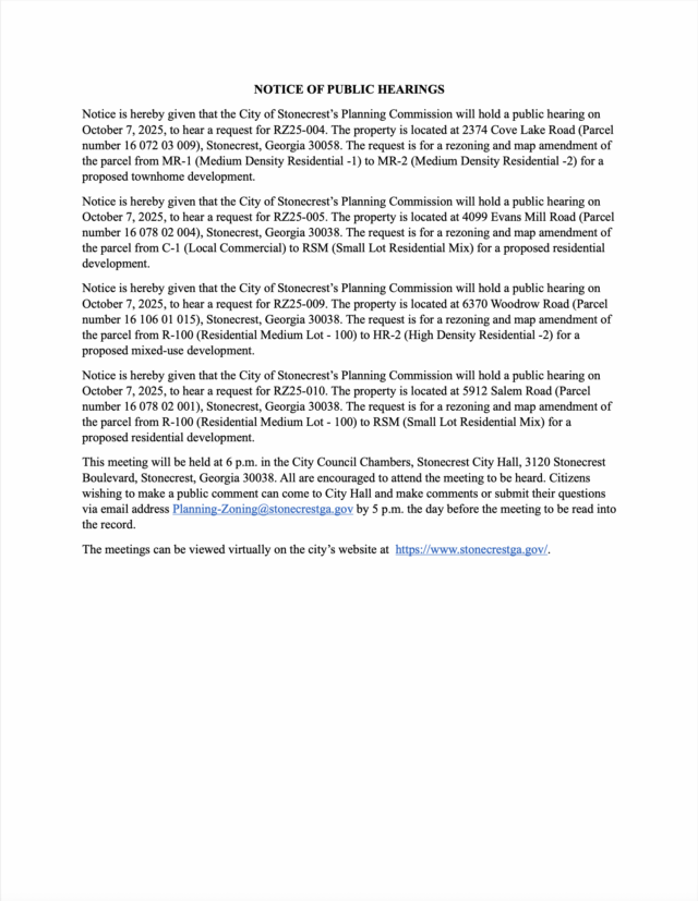 Home»Legal Notices»City of Stonecrest Planning Commission Meeting, October 7, 2025