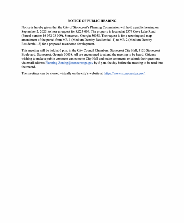 Home»Legal Notices»City of Stonecrest Planning Commission Meeting, September 2, 2025