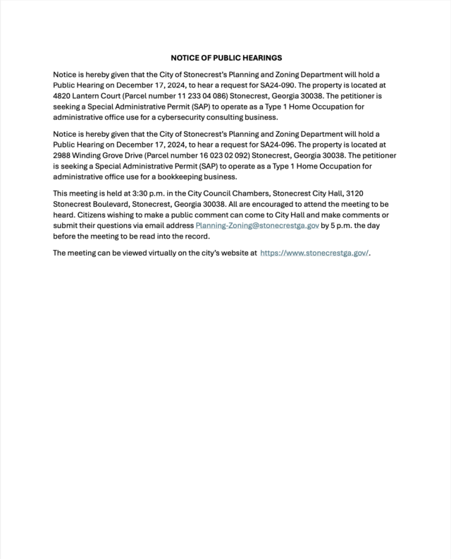 Home»Legal Notices»City of Stonecrest Public Hearing for Special Administrative Permit, December 17, 2024