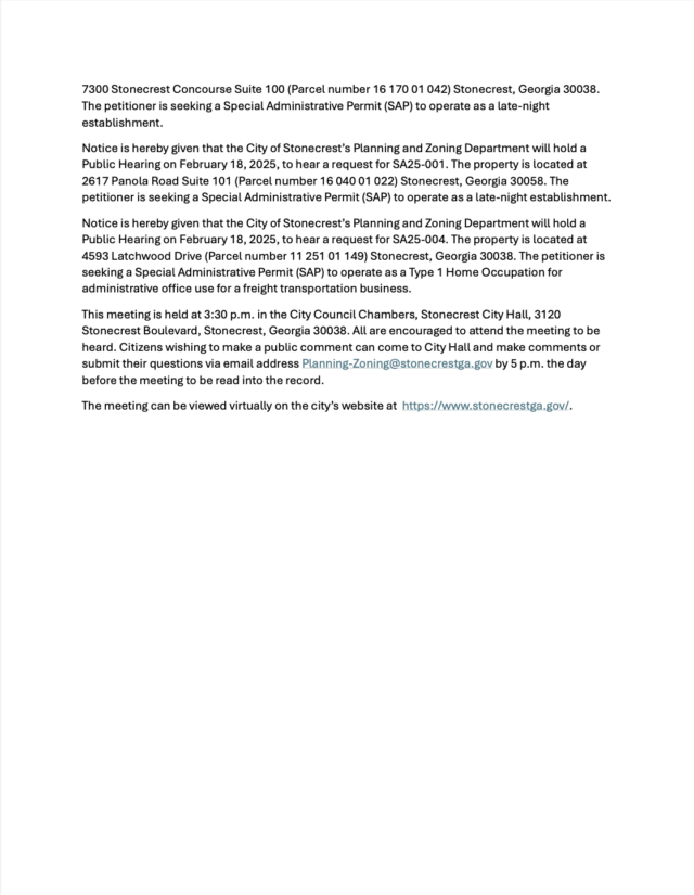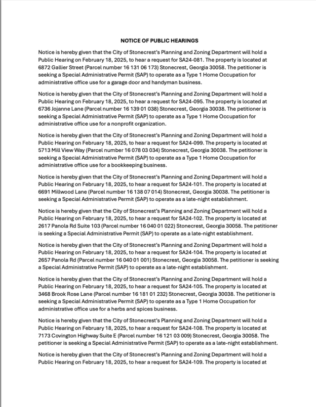 Home»Legal Notices»City of Stonecrest Public Hearing for Special Administrative Permit, February 18, 2025