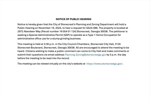 Home»Legal Notices»City of Stonecrest Public Hearing for Special Administrative Permit, November 19, 2024