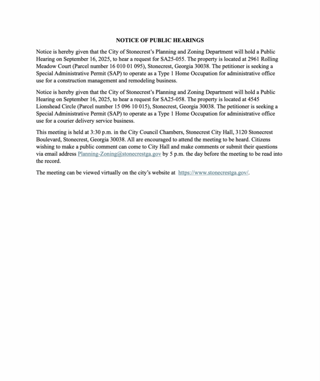 Home»Legal Notices»City of Stonecrest Public Hearing for Special Administrative Permit, September 16, 2025