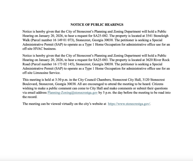 Home»Legal Notices»City of Stonecrest Public Hearing for Special Administrative Permits, January 20, 2026