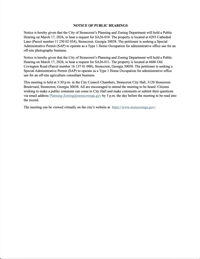 Home»Legal Notices»City of Stonecrest Public Hearing for Special Administrative Permits, March 17, 2026